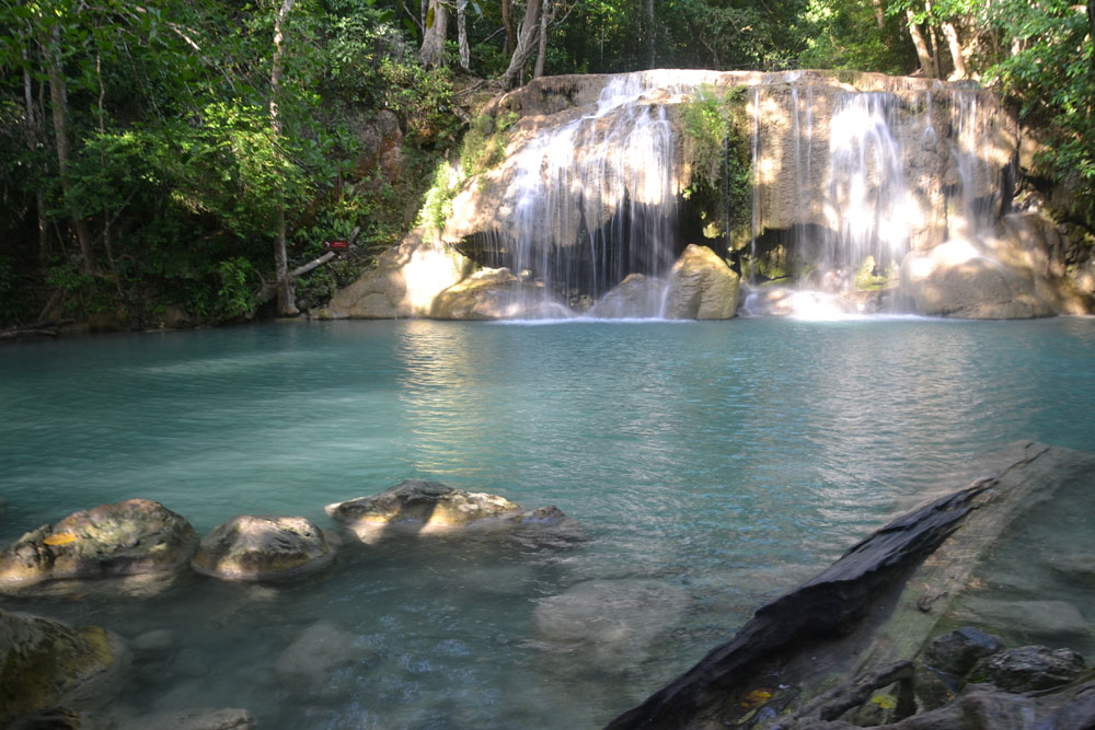 I had about 5-6 days to spare before I had to take my flight to my next destination and I figured I had seen most of what Bangkok had to offer. So I decided I’d go visit Kanchanaburi during this time since it’s only a stonethrow away from Bangkok and it has some sights worth visiting. To be honest, for the first couple of days I was pretty much dying in my hotel room from a bad stomach ache. Well maybe not dying, but it kept me down for a couple of days. After a couple of days, Alina came up to Kanchanaburi as well and we went around a bit sightseeing. We went to the nearby Erawan park and Erawan falls. Lovely Erawan Falls in Kanchanaburi The park itself was about an hour busride away from Kanchanaburi itself and there was an hour and half hike or so to the top. The last bus leaves around 2-3 already back to Kanchanaburi, so with this we decided to stay overnight in Erawan park. You could rent camping equipment there and set up camp in the park. Since I’ve never been camping before, I took the chance to try it out. It wasn’t exactly wild camping, but it did the job. Careful! Little cute deers passing!One of the swimming pools at Erawan FallsAlina taking a refreshing dip in one of the lower level pools There are about 7 levels or tiers of the Erawan waterfalls. The first day we walked up to the 4th one before they closed the entrance to it. The first impressions were amazing already and we even took quick dip in the first pool. Beware though, there are monkeys spread out in the forest and they are pretty clever. I had a bag with 2 chinese pears in it and some candy and they just snatched the bag from behind Alina while she was taking pictures of me in the water. Damn monkey stole my snack! Damned monkey that stole my fruit snack! Note the wrapping.Crystal clear water from the Erawan Falls Anyway, the next morning we woke up early to beat the crowd and hiked up to level 7. Which was totally worth it. The water was so azure blue and clear that it was hard to believe that it was a natural pool. We both took our time to enjoy the water for a dip and swim before the first visitors arrived and we made our way back down. By the time we got to the bottom the biggest pool was aleady filled with visitors. So I’m really glad we stayed in the park for the night. Afterwards, we headed back to town and I went back to Bangkok, awaiting my flight to Yangon, Burma!
